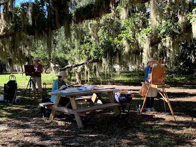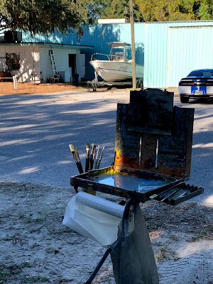 The Low Country is known for its Live Oaks dripping with Spanish Moss. They are huge, and beautiful, and a challenge to paint! In my workshops, we have long conversations about what color that moss is. Why? Because it is ever changing as the light hits from different directions. Sometimes it looks grey or grey-green, and almost blends in with the color and value with the foliage. Other times, like this one, it becomes a yellowy gold because the light is coming through it. Discovery requires observation in real time.